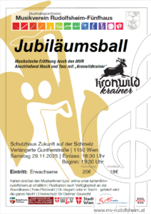 Ein Jahrhundert voller Musik! Anlässlich des 100-jährigen Bestandsjubiläum veranstaltet der MV Rudolfsheim den diesjährigen Jubiläumsball. Feiern Sie gemeinsam mit den Musiker*innen des MV Rudolfsheim getreu dem Motto „Ob elegant oder in Tracht – gefeiert wird die ganze Nacht!“ Musikalische Eröffnung …