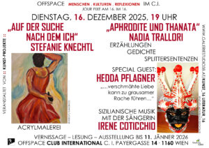 Jour fixe am 16. im 16. Stefanie Knechtl – „Auf der Suche nach dem Ich“. Malerei. Nadia Trallori – „Aphrodite und Thanata“. Lesung. Special Guest: Hedda Pflagner Sizilianische Musik mit der Sängerin Irene Coticchio