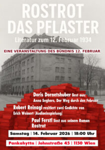 Literatur zum 12, Februar 1934 Doris Dornetshuber liest aus Anna Seghers "Der Weg durch den Februar" Robert Reinagl rezitiert zwei Gedichte von Erich Weinert (Audioeinspielung) Paul Ferstl liest aus seinem Roman "Rostrot"