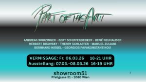 Ausstellung mit Werken von Herbert Bisovsky, Rene Neuhauser, Bernhard Niegel, Georgios Papakonstantinou, Bert Schifferdecker, Therry Schlaffer, Andreas Wurzinger, Manuel Zuliani. Vernissage Freitag, 6.3. 18 - 21 Uhr Ausstellung Samstag 7.3. und Sonntag 8.3. 16 - 19 Uhr