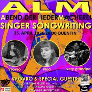ALM 25.APRIL 2026 20:00 Abend der Liedermacherei @ Kaffeebar Quentin, Kaiserstraße 1070 Wien Vrovro & special guests eine Bühne für zeitgenössische Liedermacherei freie Spende! wir spielen gegen Hut! Gefördert durch den Bezirk Margareten, den Bezirk Ottakring & der dezentralen Bezirksförderung Vrovro G. singt ihre Lieder und lädt andere ein mit ihr die Bühne zu teilen. Special guests: Noa @callmenoaa Very GRANDPA @verygrandpa Meldet euch gerne!/Register to play Pro Act 30-45min/each act 30-45 minutes vrovro.geiger@gmx.at Spots available: 10.7. Concerto 11.12. Concerto …