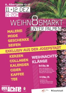 Kleiner, feiner Weihnachtsmarkt im denkmalgeschützten Laubengang des Ludo-Hartmann-Hofs und in der dahinter liegenden Redaktion der Josefstadt Zeitung derAchte. Mit originellen und originalen Einzelstücken von hochkarätigen, vorwiegend Josefstädter Designer:innen, Künstler:innen und Produzent:innen - überwiegend fair, nachhaltig und lokal hergestellt. Rahmenprogramm: Do, 11.12., 18h: Konzert Gesang & Improvisation – Aaron Josi Sternbauer und die Kursteilnehmer:innen aus dem Musischen Zentrum Wien Fr, 12.12., 17h: Kinderchor des Musischen Zentrums Wien unter der Leitung von Naghme Rezaeinjad