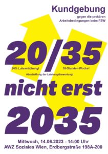 Mittwoch, 14.06., 14 Uhr, AWZ Soziales Wien, Erdbergstraße 198A-200 Am 14.06. finden die Kollektivvertragsverhandlungen des Fonds Soziales Wien (FSW) bezüglich Lohnerhöhung statt und wir als Basisgruppe von Obdach Wien nehmen diesen Tag zum Anlass um gegen die ausbeuterischen, neoliberalen Arbeitsbedingungen des FSW und dessen Sozialpolitik zu protestieren. Die untragbaren Arbeitsbedingungen mit 6-Tage-Wochen und Unterbesetzung in einem ohnehin schon sehr fordernden Arbeitsbereich führen zu ständiger Fluktuation und Krankenständen – und werden dafür nicht einmal angemessen entlohnt. Stattdessen bewerten unsere Führungskräfte anhand …