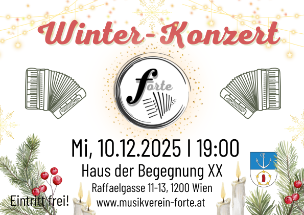Erleben Sie mit dem Akkordeonorchester Forte einen schwungvollen Winterabend und freuen Sie sich auf alte Hadern, feinste Superhits und eine Brise Weihnachtliches. Mit Benny Goodman, Henry Mancini, Astor Piazzolla und vielen mehr entzünden wir Klanglichter an einem dunklen Dezembertag und bringen wohlige Wärme. Dazu gibt es Punsch, Kekse und andere Leckereien.