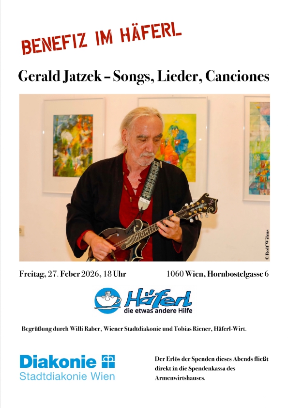 Songs, Lieder, Canciones: Der Poet, Musiker, Sänger Gerald Jatzek lädt am Freitag, 27. Feber 2026, 18 Uhr, zu einem Benefizabend ins „Häferl“ (Hornbostelgasse 6, 1060 Wien). Die Spenden kommen zur Gänze dem Armenwirtshaus der Wiener Stadtdiakonie zugute, das fünf Tage die Woche für bis zu 400 Gäste kocht.