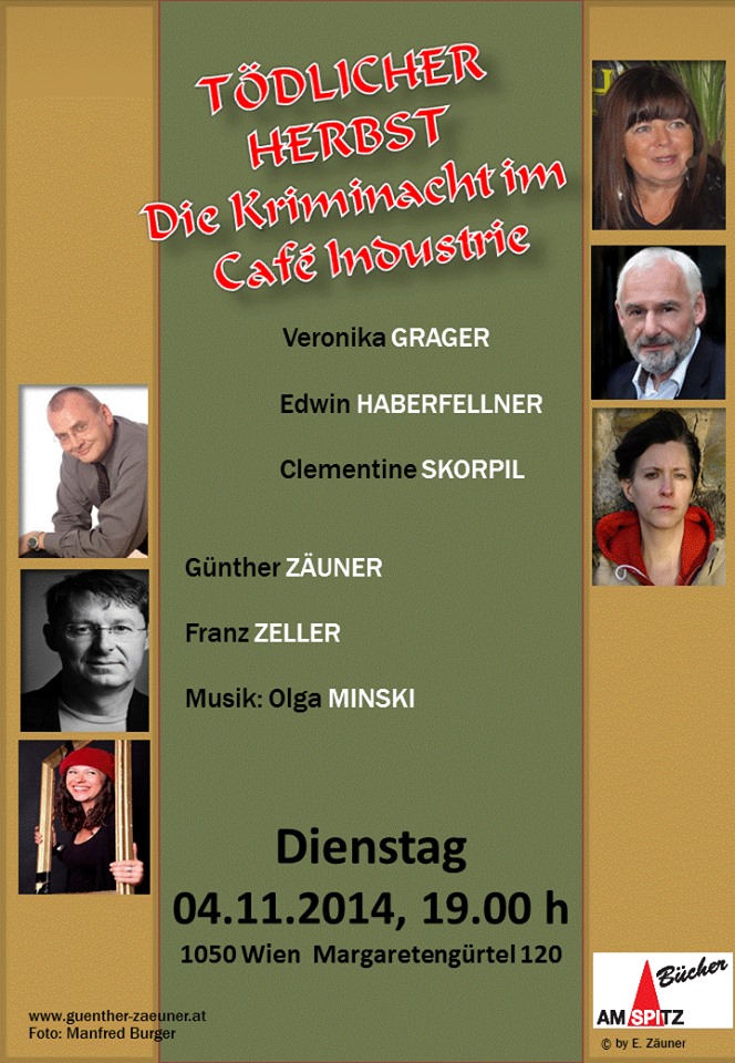 Spannung pur wird geboten, wenn Günther Zäuner KrimikollegInnen zur Lesung bittet! Es lesen mit ihm: Clementine Skorpil, Veronika Grager, Edwin Haberfellner und Franz Zeller aus ihren aktuellen Krimis. Musikalisch wird dieses mörderische Quintett von der Pianistin und Songwriterin Olga Minski begleitet.