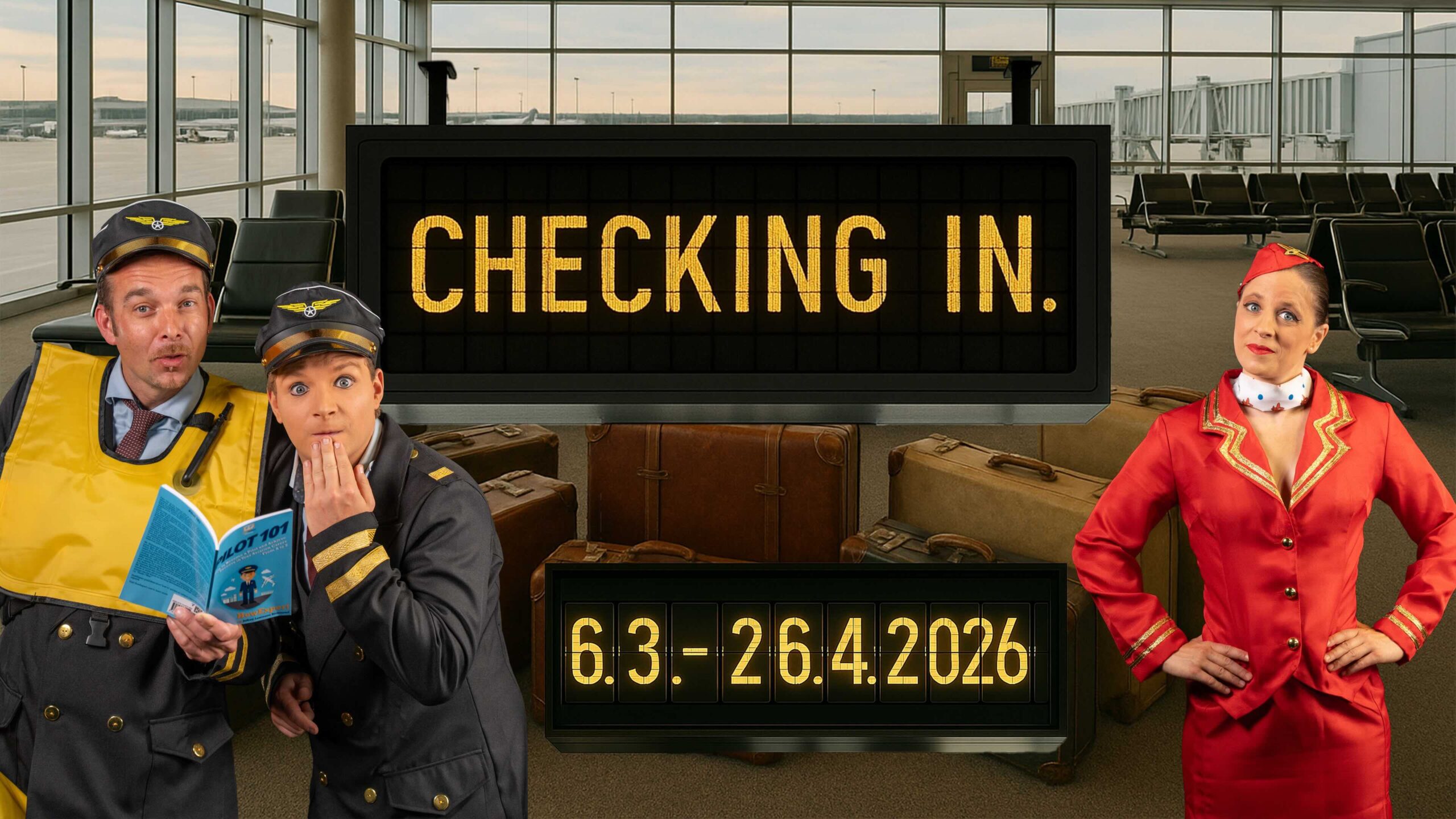 Während alle verzweifelt auf den Flug warten, greifen die Piloten selbst zu den wildesten Tricks, um den Abflug möglich zu machen – mit jeder Menge Artistik, Musik und schrägem Humor. Koffer verwandeln sich plötzlich in Jonglierbälle, Sitze in Balancegeräte und selbst die Durchsagen am Gate werden zur Comedy-Nummer.
