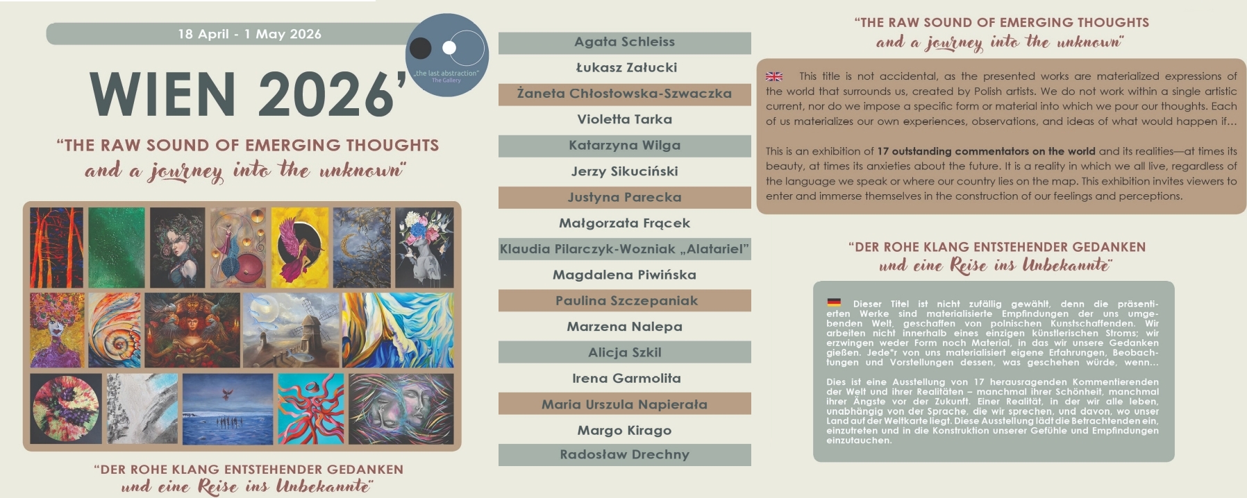 Dieser Titel ist nicht zufällig gewählt, denn die präsentierten Werke sind materialisierte Empfindungen der uns umgebenden Welt, geschaffen von polnischen Kunstschaffenden. Sie arbeiten nicht innerhalb eines einzigen künstlerischen Stroms; sie erzwingen weder Form noch Material, in das sie ihre Gedanken gießen. Jede*r von ihnen materialisiert eigene Erfahrungen, Beobachtungen und Vorstellungen dessen, was geschehen würde, wenn…