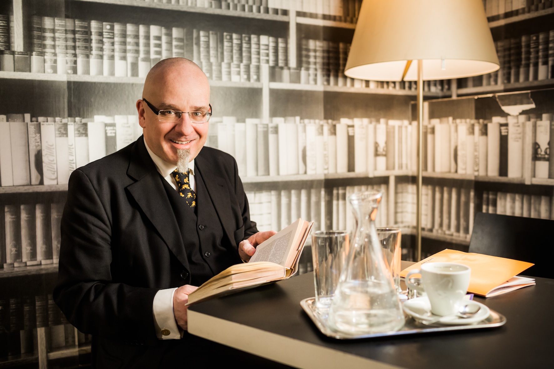 Das Foto zeigt Rezitator Gregor Oezelt im Wiener Café Korb, Foto/©: www.peterberger.at