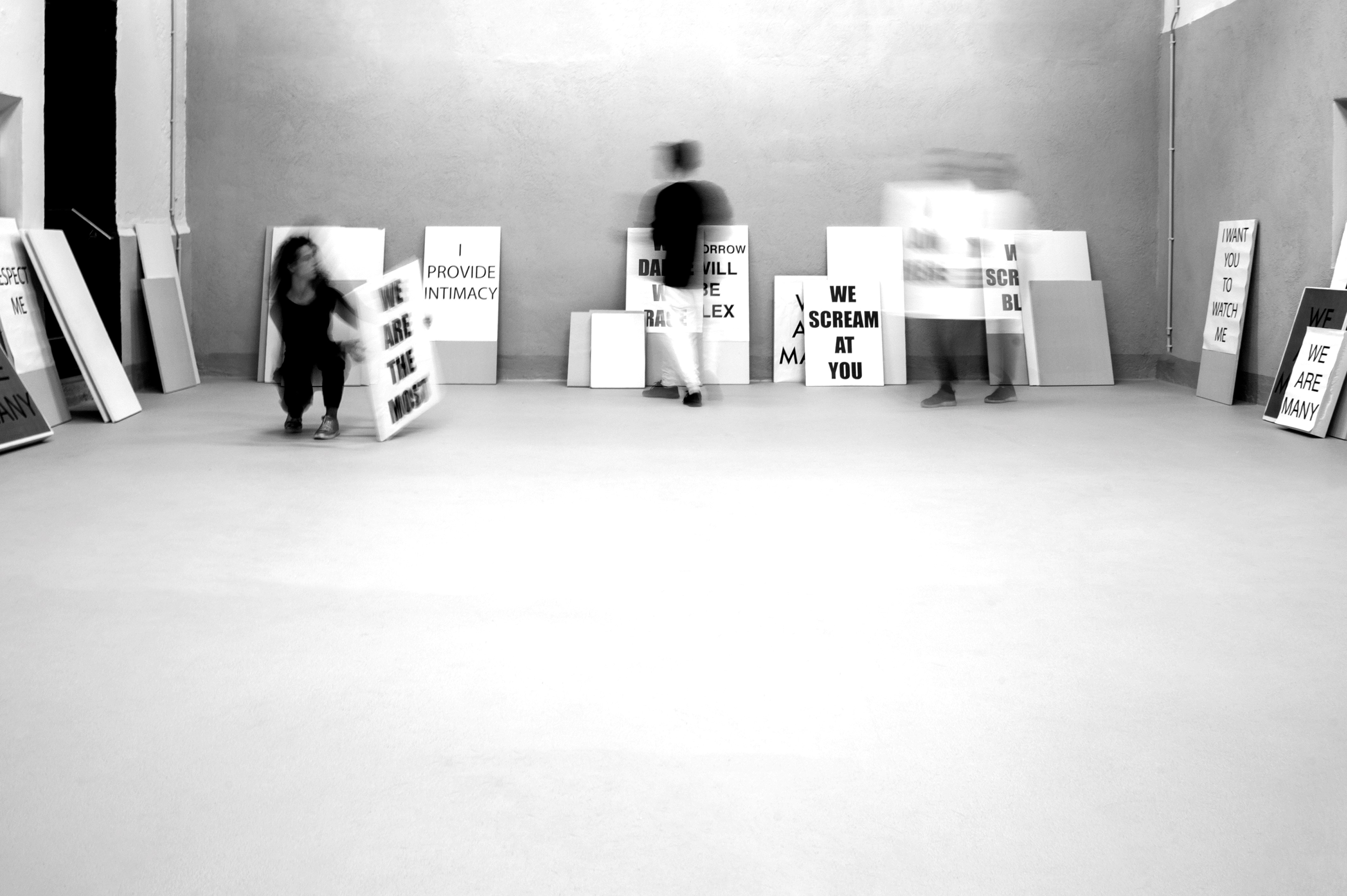 WE WILL NOT LET YOU GO untersucht Subjektkonstruktionen innerhalb unserer westlichen Gesellschaft, Augenblicke vermeintlicher Gemeinsamkeit und die Isolation jedes einzelnen Menschen. Im Mittelpunkt des Projekts stehen die Sichtbarmachung von Machtstrukturen, Anschauungen und Wertsysteme innerhalb unserer Sprache und in Gruppenhierarchien. Außerdem werden die symbolische Aneignung von Raum und soziale Kontrolle thematisiert. Mit Tafeln und Schildern ausgestattet formieren sich die Performer*innen immer wieder neu zu einer Gruppe „stiller Sprechender“, die die Betrachter*innen auffordern, ihre eigene Stimme zu hören und zu Leser*innen zu werden.