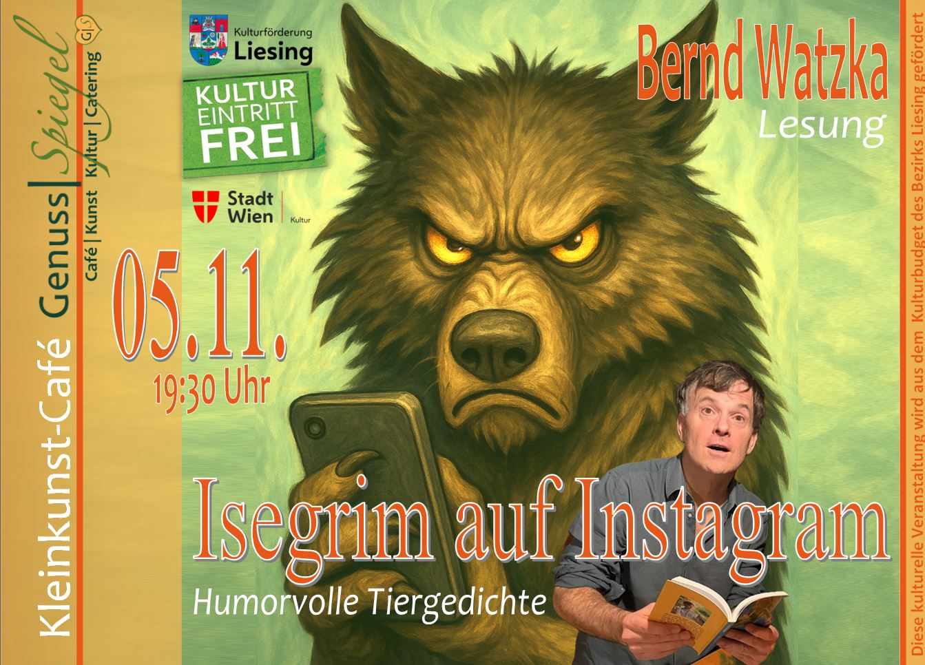 GenussSpiegel präsentiert: „ISEGRIM AUF INSTAGRAM“ – Humorvolle Tiergedichte von und mit dem Autor Bernd WATZKA – EINTRITT FREI