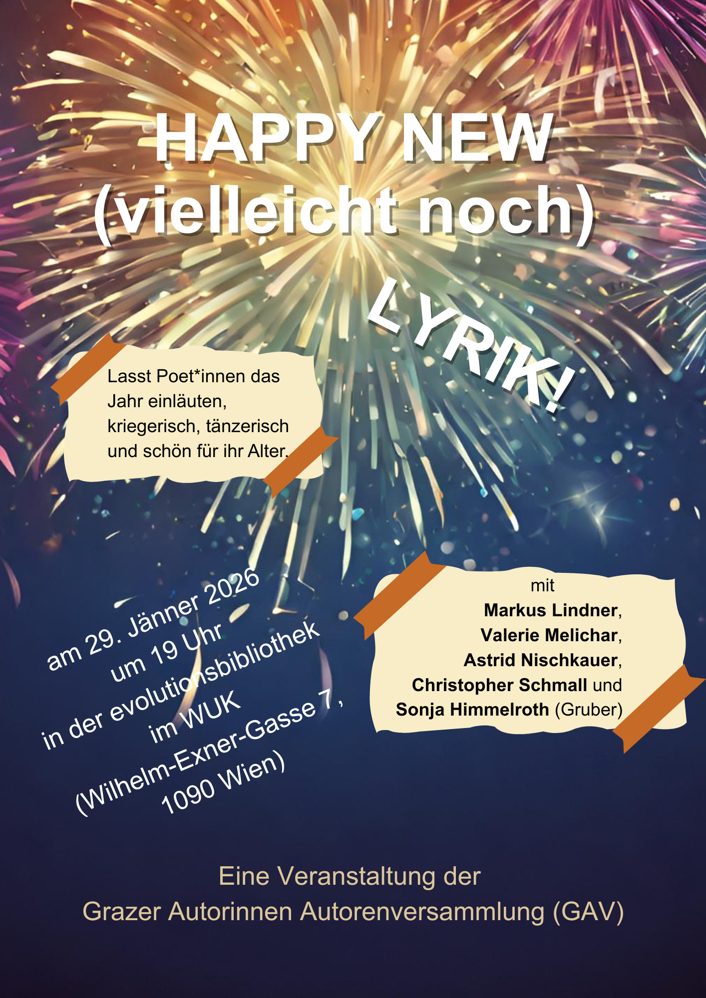 Autor_innen lesen ihre Lyrik. Veranstaltet mit der Grazer Autorinnen Vereinigung (GAV) in der evolutionsbibliothek: Sonja Himmelroth (Gruber), Markus Lindner, Valerie Melichar, Astrid Nischkauer und Christopher Schmall lesen neue Lyrik und darüber hinaus.