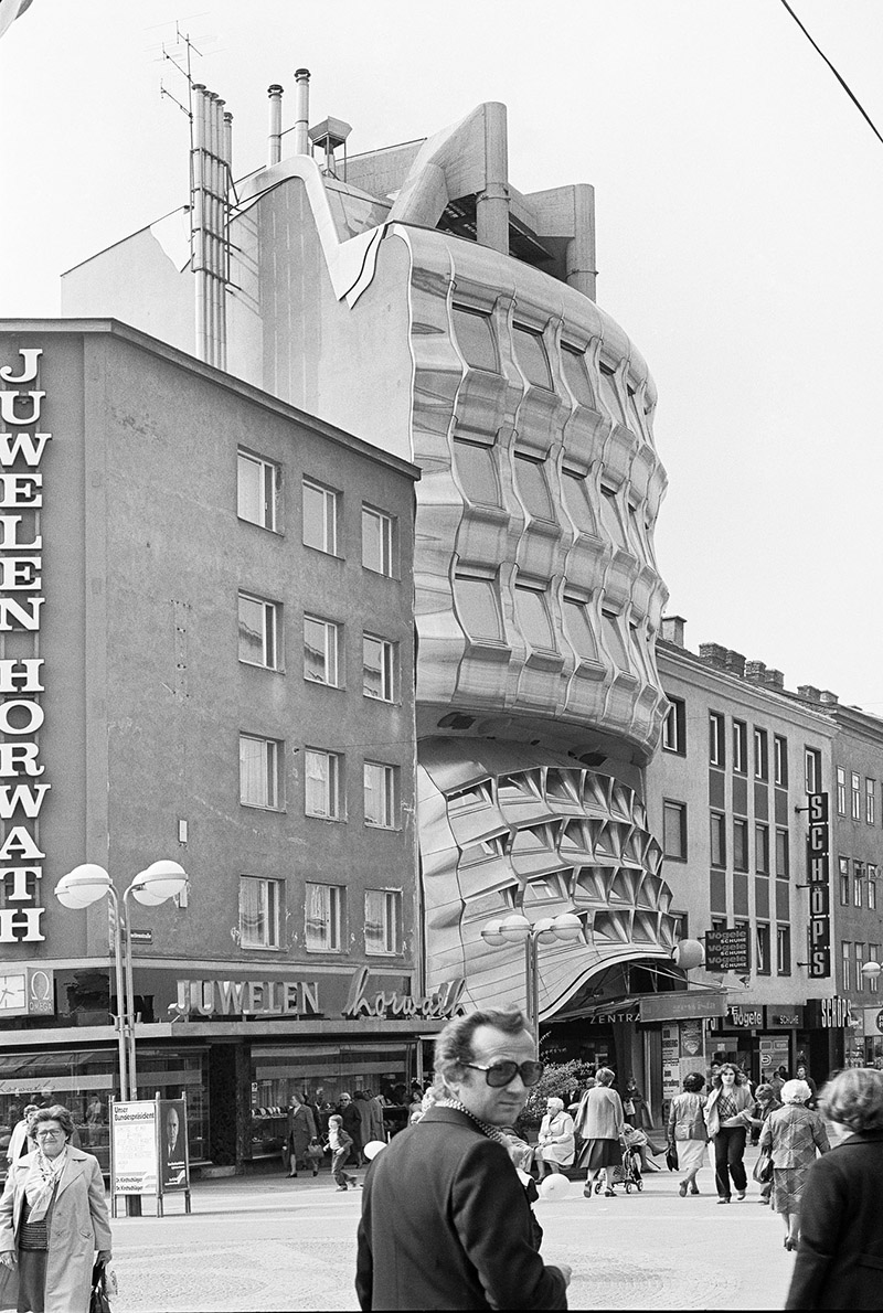 In der Fußgängerzone des 10. Wiener Gemeindebezirks trifft man unvermittelt auf das „Haus mit dem Knick“ (Günther Domenig), den bedeutendsten Bau der „Grazer Schule“ aus ihrer frühen Zeit. Domenig gelangt in einem teilweise parallel verlaufenden Entwurfs- und Realisierungskonzept zu einer völlig neuen Architektursprache: Die beherrschenden Materialien Beton, Stahl und Blech scheinen einem geradezu unaufhaltsamen Wucherungsprozess zu unterliegen. Sämtliche Teile der Konstruktion und Haustechnik bleiben nicht nur sichtbar an der Oberfläche, sondern bilden zusätzlich eine biomorphe Ästhetik: Man fühlt sich an Organisches wie Knochen, Sehnen, Häute, Schuppen, Adern erinnert.