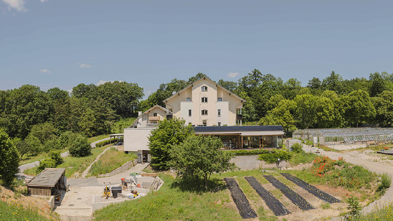 Neben Wohneinheiten und Gemeinschaftsräumen gestalteten gaupenraub+/- hier Gästezimmer, Werk- und Seminarräume, ein 600 m² großes Biotop sowie Gemüsefelder, Gewächshäuser und eine zum Hühnerstall umfunktionierte alte Scheune. Die Gemeinschaft vor Ort bietet sowohl Halt als auch eine Tagesstruktur mit einer regelmäßigen, passenden Arbeit rund um die Landwirtschaft und die neue Architektur. Langfristig soll sich das Projekt durch den Verkauf von Eiern und Gemüsekisten, Catering sowie der Raum- und Zimmervermietung selbst tragen.