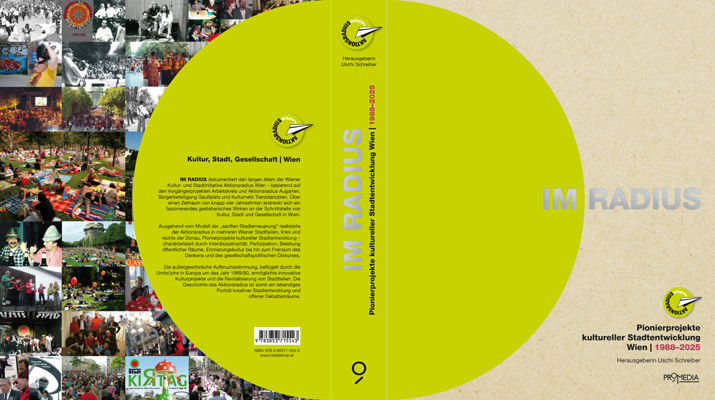 Das Buch „IM RADIUS – Pionierprojekte kultureller Stadtentwicklung Wien | 1988–2025“ ist ab sofort im Buchhandel oder im Promedia Verlag erhältlich (www.mediashop.at). Das Buch dokumentiert die Kulturarbeit des Aktionsradius und seiner Vorgängerprojekte über fast vier Jahrzehnte. Am 23. Oktober wird das Buch am Gaußplatz 11, 1200 Wien, präsentiert. Aufgrund der vielen Mitwirkenden ist die Veranstaltung schon fast ausreserviert – wer noch dabei sein möchte, bitte rasch für die letzten Plätze anmelden unter office@aktionsradius.at, danach wird die Warteliste eröffnet. Die Buchpräsentation erfolgt durch das Projekt-Team Ania Gleich, Uschi Schreiber (Hg.) und Suzie Wong und wird durch langjährige Wegbegleiter (CMCM) musikalisch begleitet.