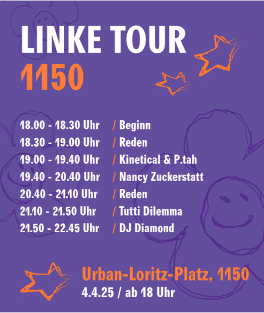 Am 4. April startet die LINKS Linke Tour 2025 mit Tutti Dilemma, Ptah & Kinetical, DJ Diamond und Nancy Zuckerstatt. Gemeinsam mit der KPÖ geht es in die heiße Wahlkampfphase. Wie schon 2020 dient die Tour als Treffpunkt für Passantinnen, Interessierte und Aktivistinnen. In Wien werden an sechs Standorten politische Reden, Musik und Getränke geboten – ein Mix aus Information, Reflexion, Motivation und Feiern. Auftakt mit Action und Agitation am Urban Loritz Platz!