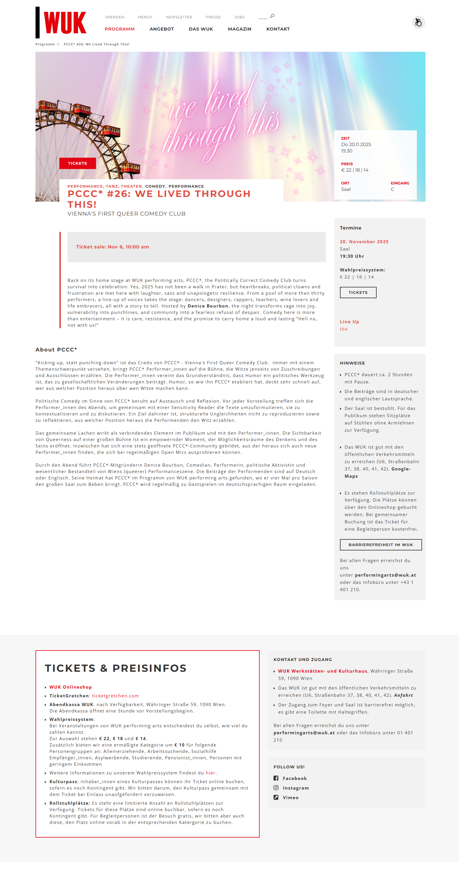 Back on its home stage at WUK performing arts, PCCC*, the Politically Correct Comedy Club turns survival into celebration. Yes, 2025 has not been a walk in Prater, but heartbreaks, political clowns and frustration are met here with laughter, sass and unapologetic resilience. From a pool of more than thirty performers, a line-up of voices takes the stage: dancers, designers, rappers, teachers, wine lovers and life embracers, all with a story to tell. Hosted by Denice Bourbon, the night transforms rage into joy, vulnerability into punchlines, and community into a fearless refusal of despair. Comedy here is more than entertainment – it is care, resistance, and the promise to carry home a loud and lasting “Hell no, not with us!”