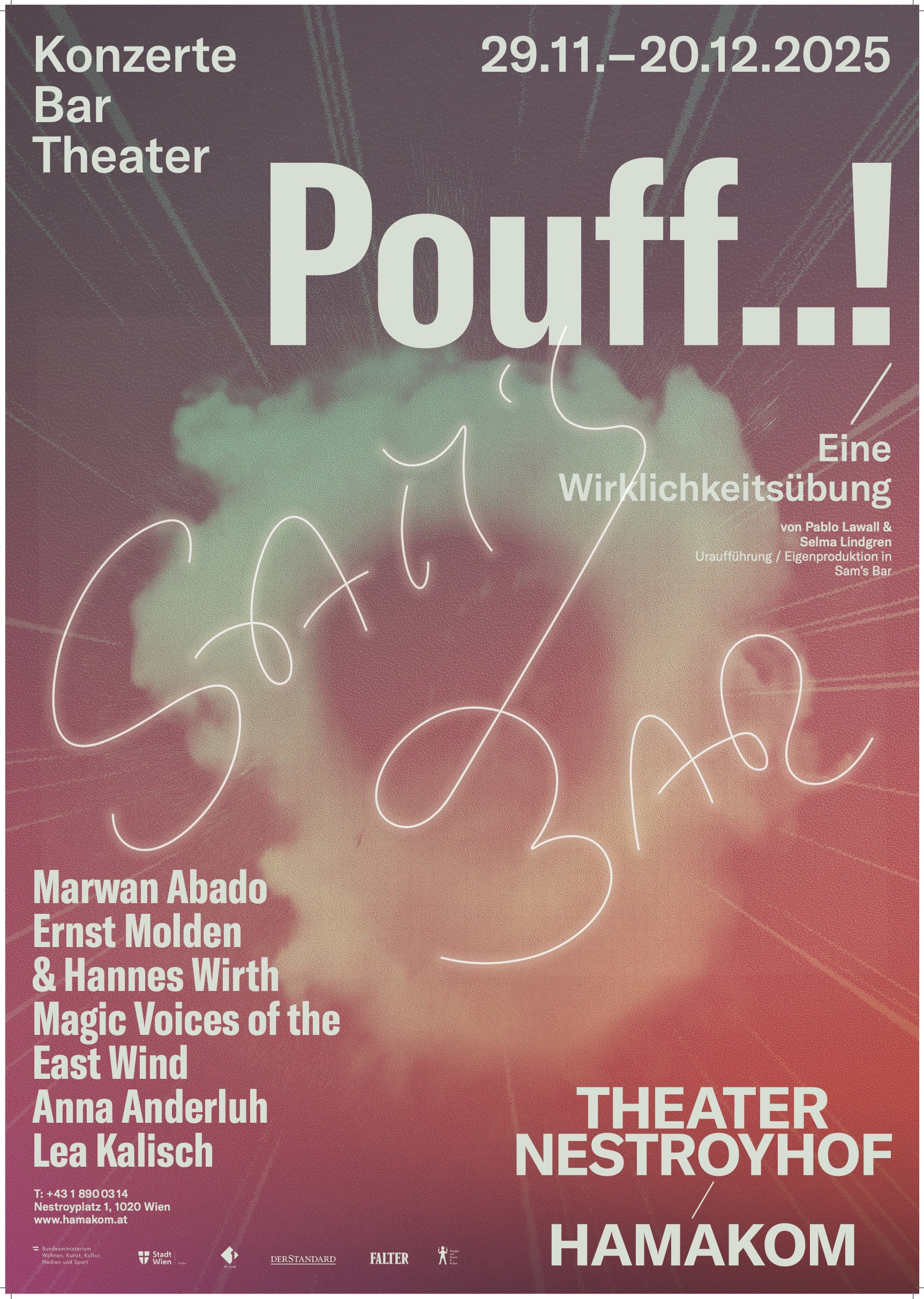 Im Dezember 2025 trifft arabische Tradition auf Klezmer, gleiten bosnische, kurdische, syrische und iranische Wiener Sängerinnen mit müheloser Leichtigkeit über jede Grenze, bringt ein stadtbekannter Wiener einmal mehr die große weite Welt nach Hause, feiert eine Frau das Sinnlose und Verwegene und bringt Rebetzin Lea den Saal zum Leuchten. Geht doch, könnte man meinen! Bei einem Besuch des Theaterabends „Pouff…!“ können Wahrheitsliebende und Wahrheitssuchende mit zauberhaften Schauspieler:innen und Musiker:innen Wirklichkeit üben.