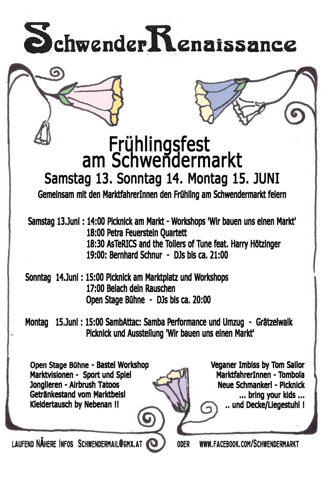 Frühlingsfest am Schwendermarkt. Drei Tage wird gemeinsam mit den AnrainerInnen, MarktfahrerInnen und BesucherInnen der Frühling am Markt gefeiert! Unter dem Motto „Wir bauen uns einen Markt“ wird drei Tage mit verschiedenen Bastelworkshops für Groß und Klein, Airbrush Tatoos, Rollrasen, Liegestühlen, Planschbecken, Livemusik (Bernhard Schnur, Petra Feuerstein Quartett, AsTERICS and the Toilers of Tune, Belach dein Rauschen, SambAttac) der (Spät)Frühling begrüßt und kreativ über die Renaissance am Schwendermarkt fantasiert. Ein großes Architekturmodell und UrbanKnitting – Häkeln für den öffentlichen Raum – stehen unter anderem am Programm.