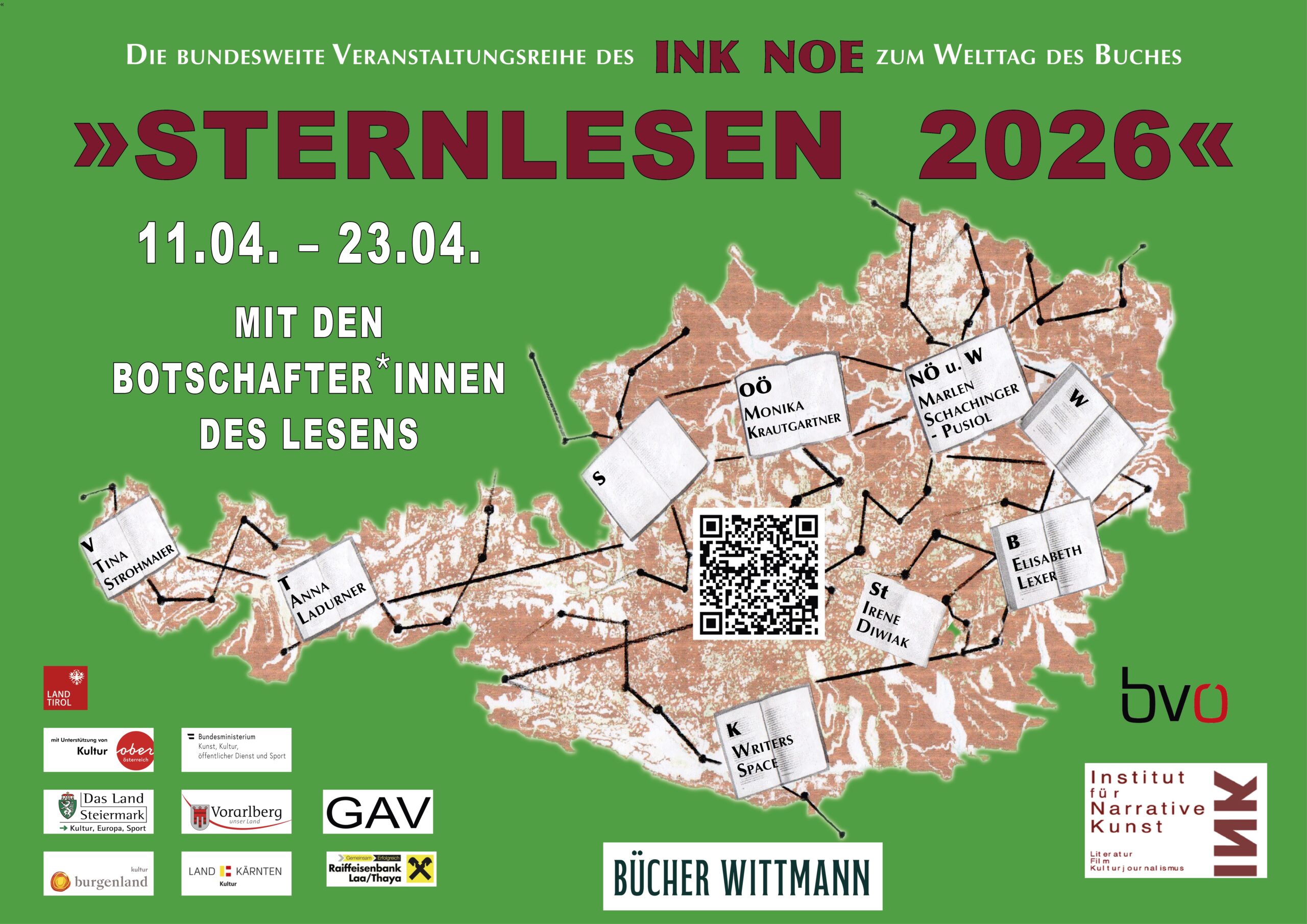 Initiiert und organisiert wird STERNLESEN von Marlen Schachinger-Pusiol, die diese wichtige Aktion bei Bücher Wittmann präsentiert. Sie wurde im Dezember 1970 geboren. Geschichten wuchsen mit ihr, stärkten sich am Klang der Wörter in Gedichten, verzweigten sich in der Lektüre in alle Himmelsrichtungen, schufen Universen und Bildwelten, wurden Klangraum und Lebensmittel. Sie sieht, was vor sich geht, will Welt in ihrem Sein und ihrem Könnte umfassen, will gestalten. Sei es in ihren Büchern, in ihren Filmen, sei es in fremden Sprachwelten oder in den Erzählungen anderer, denen sie zur Welt verhilft. Da dies alles auch einen Boden braucht, studierte sie Komparatistik und Sprachen.