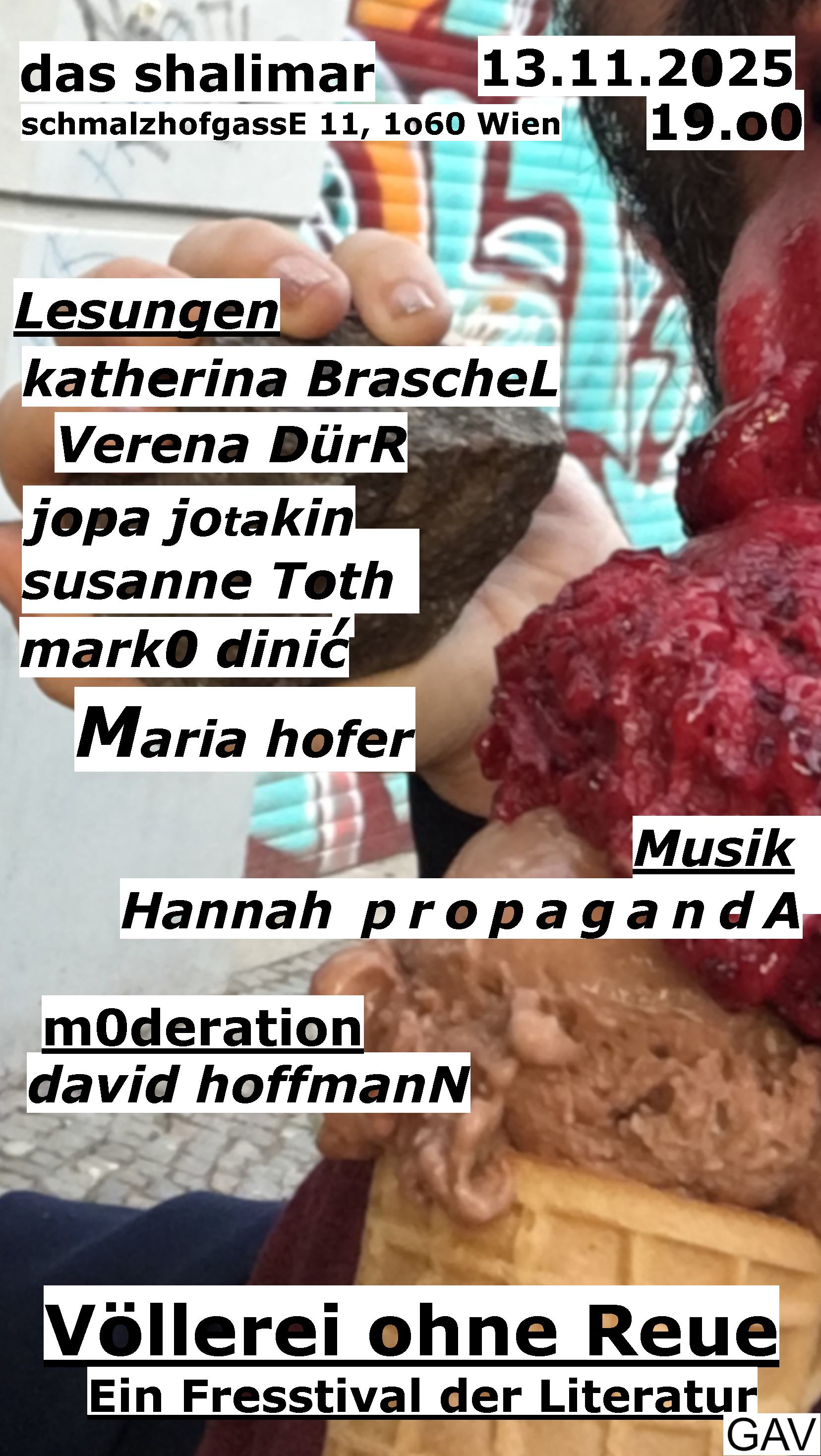 mit Lesungen von Katherina Braschel, Marko Dinić, Verena Dürr, Maria Hofer, jopa jotakin, Susanne Toth und Musik von Hannah Propaganda