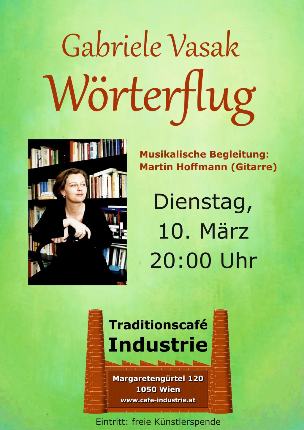 Die Wiener Schriftstellerin und freie Journalistin Gabriele Vasak fliegt in dieser Lesung am Saum der Wörter ihrer literarischen Werke durch das Universum der Sprache. Veröffentlichtes, aber auch bisher Unveröffentlichtes von „Mauersegeln“ über „Sturzfliegen“ bis hin zu dunkelweißen Gedichten mit der musikalischen Begleitung von Martin Hoffmann an der Gitarre.