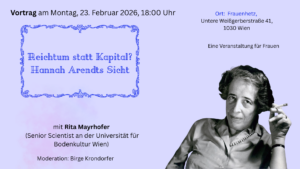 Für Arendt ist echter Reichtum nicht die Vermehrung von Kapital oder Vermögen. Es ist der kulturelle, soziale und politische Reichtum einer Gemeinschaft, die sich selbst organisiert, ihre Angelegenheiten öffentlich verhandelt und dabei neue Räume der Freiheit eröffnet. In der Krise unserer Zeit hilft uns Arendts Denken, Planung und Politik neu zu verstehen: nicht als Werkzeug mit Mittelzweck-Rationalität, sondern als Öffnung für das Unvorhersehbare, die Pluralität und den spontanen Neubeginn. mit Rita Mayrhofer (Senior Scientist an der Universität für Bodenkultur Wien) …