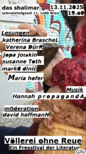 mit Lesungen von Katherina Braschel, Marko Dinić, Verena Dürr, Maria Hofer, jopa jotakin, Susanne Toth und Musik von Hannah Propaganda moderiert und organisiert von David Hoffmann Gierig greifen wir in den Wörtertopf, werfen Texte in Pfannen, Buchstaben auf den Grill, braten, sautieren, dämpfen, schlagen uns den Wanst voll, bis wir nicht mehr können. Nur damit wir uns mit Pfauenfedern dort kitzeln, wo die gutturalen Laute unserer Gedichte geformt werden. So schaffen wir Platz für den nächsten literarischen Gang mit Zutatenlisten, …