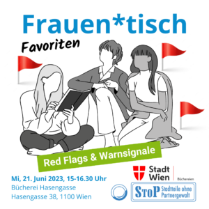 Red Flags & Warnsignale: Wir sprechen mit euch über Literatur zum Thema, informieren euch und überlegen gemeinsam mit euch Möglichkeiten um auf das Problem Femizide, häusliche Gewalt an Frauen* und Partnergewalt aufmerksam zu machen. In der Bücherei Hasengasse stellen wir uns gegenseitig unsere Lieblingsbücher zu Red Flags und Warnsignalen in Beziehungen vor. *Alle Frauen und FLINTA-Personen, die mitmachen wollen, sind herzlich willkommen! Kommt vorbei und bringt eure Freundinnen mit! Kontakt: clara.bauer@stop-partnergewalt.at 0699 1988 2361