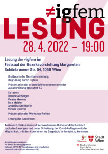 Grußwort der Bezirksvorstehung und Begrüßung durch die ≠igfem Präsentation der ersten Gewinnerinnentexte der Ausschreibung WeissNet 2.0 Es lesen: Renate AICHINGER Verena MERMER Tara MEISTER Angelika STALLHOFER Verena DOLOVAI Präsentation der Workshop-Reihe Ehrung der Jurorinnen Austausch, Diskussion und Netzwerken am Buffet und Büchertisch nach den Lesungen und unter Einhaltung der Covid-Auflagen mit der Möglichkeit, mit den Autorinnen ins Gespräch, in Kontakt zu kommen. Anmeldung erwünscht. Per Email an: news@igfem.at Geltende COVID-19 Verordnungen sind einzuhalten (voraussichtlich 2G und Maskenplicht) Diese Lesung wird …