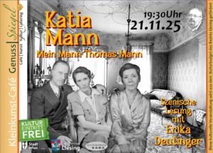 GenussSpiegel präsentiert: „Katia Mann – Mein Mann Thomas Mann“ – Szenische Lesung mit Erika DEUTINGER - EINTRITT FREI Wien | Liesing | Atzgersdorf | Kleinkunst-Café GenussSpiegel Jede und jeder kennt den berühmten Schriftsteller Thomas Mann. Aber wer war eigentlich seine Ehefrau Katia? Dieser Frage gehen Erika Deutinger (Rezitation) und Petra Pawlik-Mayerhofer (Musik) anhand einer szenischen Lesung von des Autor Helmut Korherr nach. Ein Lebensbild der Frau Katia Mann, anlässlich des 150. Geburtstages von Thomas Mann. Wann: Freitag, 21. November 2025 …