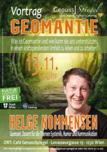 GenussSpiegel präsentiert: Geomantie – Vortrag mit Helge Nommensen Datum: Donnerstag, 13. November 2025, 17:00 Uhr Ort: Kleinkunst-Café GenussSpiegel, Levasseurgasse 19, 1230 Wien-Liesing GenussSpiegel lädt zu einem inspirierenden Abend rund um das Thema Geomantie ein. Helge Nommensen erläutert eingeführte Theorie und Geschichte der Geomantie und veranschaulicht anhand zahlreicher Fallbeispiele deren Wirkweisen und energetische Zusammenhänge auf der Erde. Im Fokus stehen zudem systemische Fragen und innere Haltungen: Wie spiegeln sich Lebens- und Arbeitsorte in uns wider, wie beeinflussen sie uns – und …