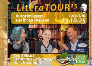 GenussSpiegel präsentiert: LiteraTOUR´25 – 3 Autoren lesen Ihre eigenen Werke - EINTRITT FREI Wien | Liesing | Atzgersdorf | Kleinkunst-Café GenussSpiegel Donnerstag, 23. Oktober 2025 – Beginn: 19:30 Uhr Die Autorenlesung: 3 Autoren lesen Ihre eigenen Werke. Mit Eva BILLISICH, Kurt HEXMANN (liest Lyrik von Helmut KORHERR (†) und Stephanie GRÜNBERGER. Der GenussSpiegel präsentiert diese Autorenlesung gemeinsam mit dem Kulturverein SABA. EINTRITT FREI – Um Anmeldung wird gebeten: Tel. 0676 57 23 023 | office@genuss-spiegel.at