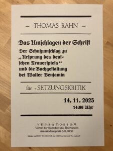 Forum für Übersetzungskritik, mit Thomas Rahn: Das Umschlagen der Schrift. Der Schutzumschlag zu „Ursprung des deutschen Trauerspiels“ und die Buchgestaltung bei Walter Benjamin