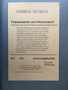 Mathias Traxler stellt in einer zweisprachige Lesung (mit Zuspiel) sein Manuskript Variationen Montale Reihe i-iv vor. Es werden darin vor den Gedichten aus Eugenio Montales Ossi di seppia unterschiedliche 'Haltungen' eingenommen. Ungefähr in dieser (oder auch umgekehrter) Reihenfolge: Einnahme der Haltung, Stillstände, Bewegung, wird dabei auf die Gedichte im italienischen Original hingesteuert, um sich möglichst nahe bei ihnen aufzuhalten. Variationen Montale Reihe i-iv wird im Herbst 2024 in der parasitenpresse erscheinen. Das Forum für Übersetzungskritik ist eine Veranstaltungsreihe von Versatorium, …