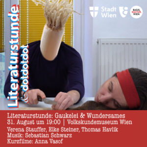 Eine surreale, multimodale Lesung in Kooperation mit dem dotdotdot Kurzfilmfestival. Lesende: Thomas Havlik Verena Stauffer Elke Steiner Musik: Sebastian Schwarz Duo Kurzfilme: Anna Vasof Moderation & Kuration: Alexandra Mitterer & Laetitia Lang & Lisa Mai Gefördert durch Mittel der Stadt Wien, des Josefstädter Kulturbudgets und der Basis Kultur Wien.